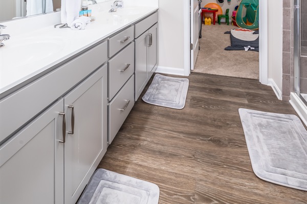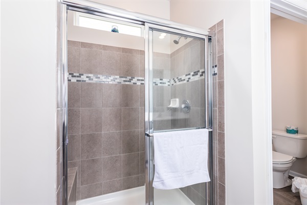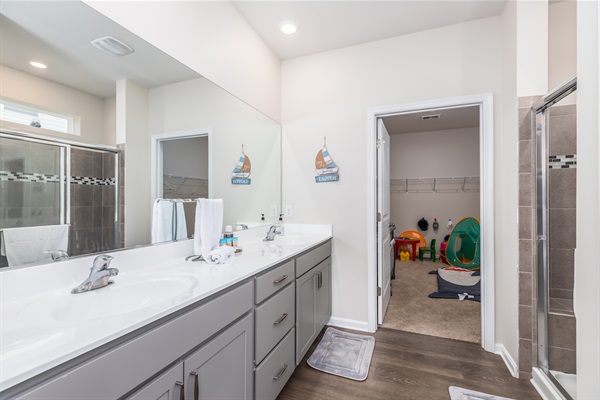 Welcome to the ensuite oasis! A spacious walk-in shower invites relaxation, complemented by a practical double vanity. A private toilet area adds a touch of privacy, completing this tranquil and functional bathroom retreat.