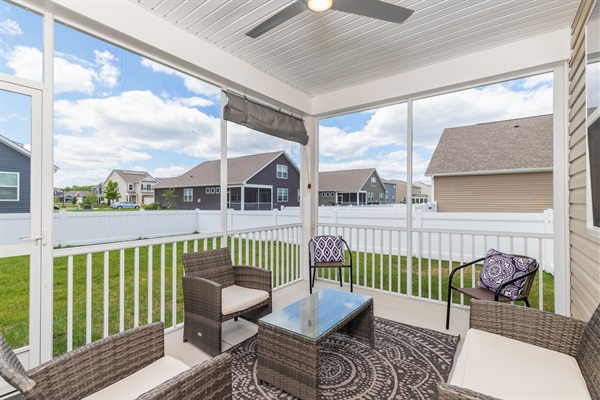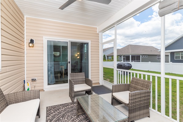 Enjoy some relaxation on the screened-in porch—perfect for morning coffee, evening cocktails, or curling up with a good book while taking in your private backyard view.