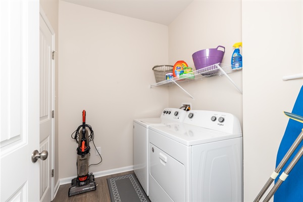 Discover our efficient laundry haven! Washer, dryer, iron and board for wrinkle-free clothes, a vacuum for tidiness, and all the essential, laundry detergent included. With practical shelving, it's a well-organized space for seamless laundry days.