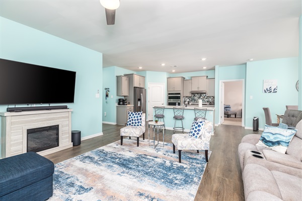 Bright, open-concept living space featuring a spacious breakfast bar, gourmet kitchen, and cozy seating—perfect for family meals, entertaining friends, or relaxing after a day at the beach.