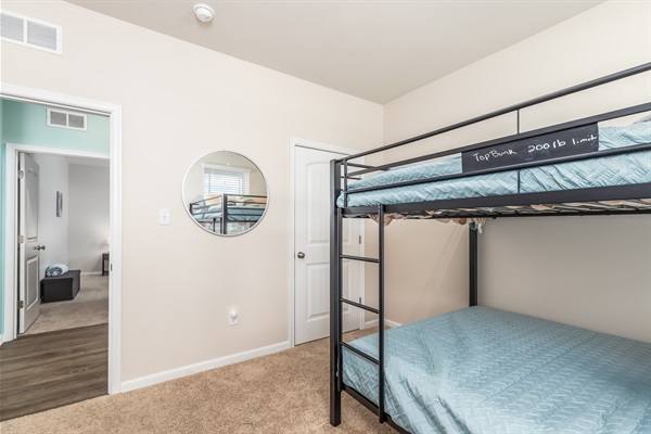 Step into our functional third bedroom! Discover a spacious desk and a wall-mounted smart TV, perfect for work and entertainment. With a double queen bunk bed, it's a dynamic space for both relaxation and productivity. ️️