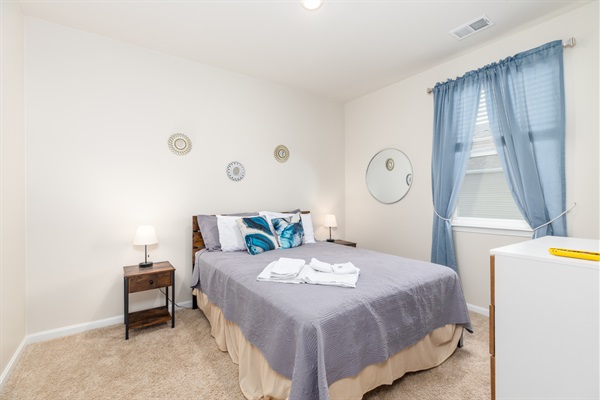 Welcome to our charming second bedroom! Rest in comfort on a queen bed and conveniently charge your devices with the USB chargers integrated into the lamps. A cozy and tech-savvy haven for a peaceful night's sleep. ️