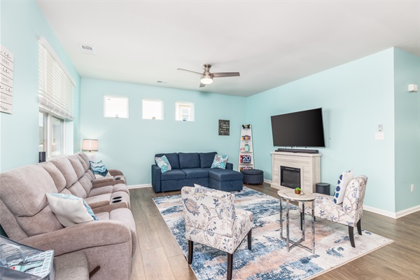 Bright family lounge featuring plush recliners, a versatile blue sleeper sofa, and a large smart TV—perfect for movie nights, game marathons, or just unwinding after a day of coastal fun.
